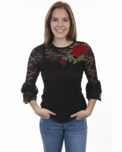 Honey Creek By Scully Women’s Rose Applique Long Sleeve Lace Top Black