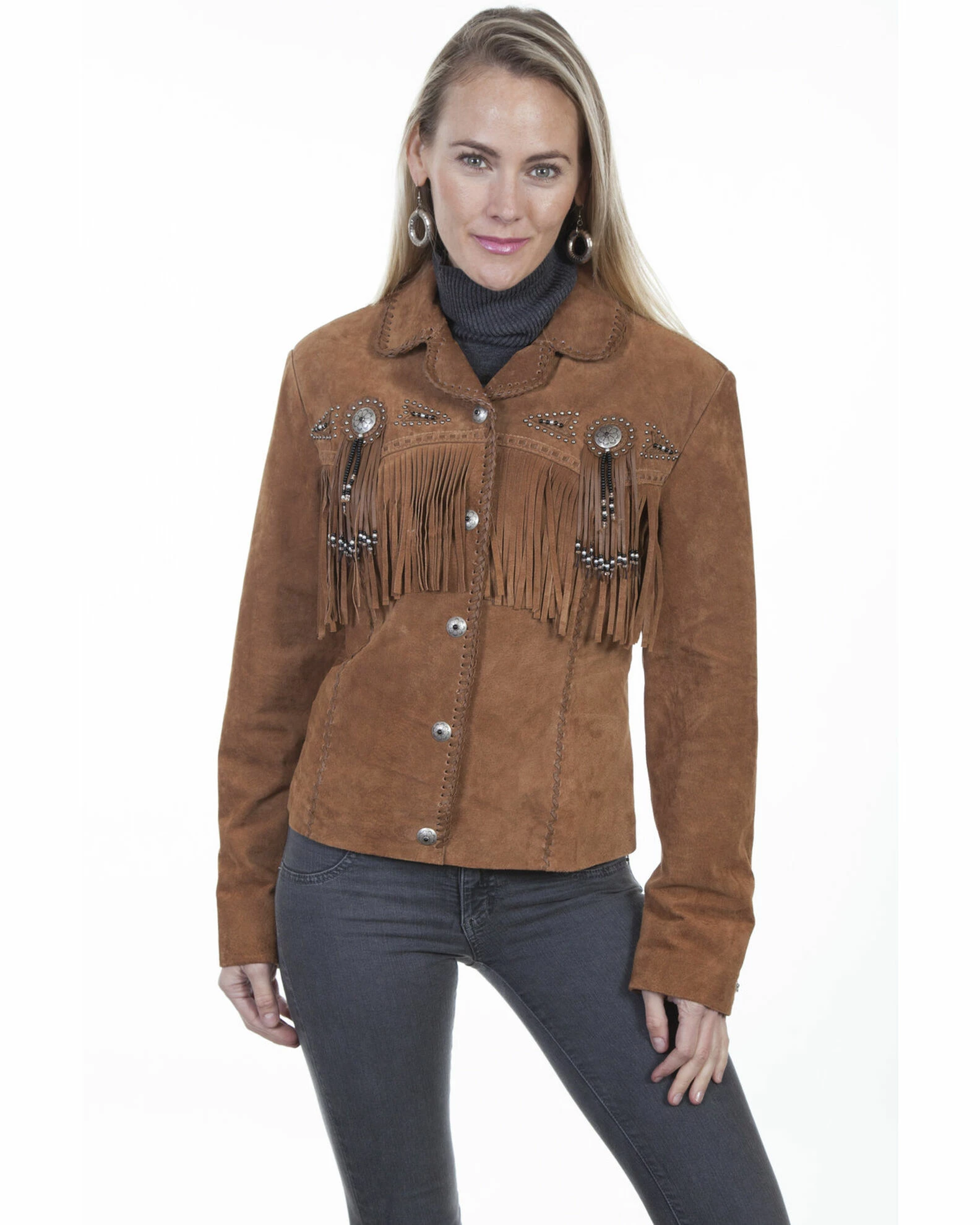 This women’s jacket by Scully is crafted of genuine boar suede. Beaded accents and fringe trim swing from the front yoke and sleeves.