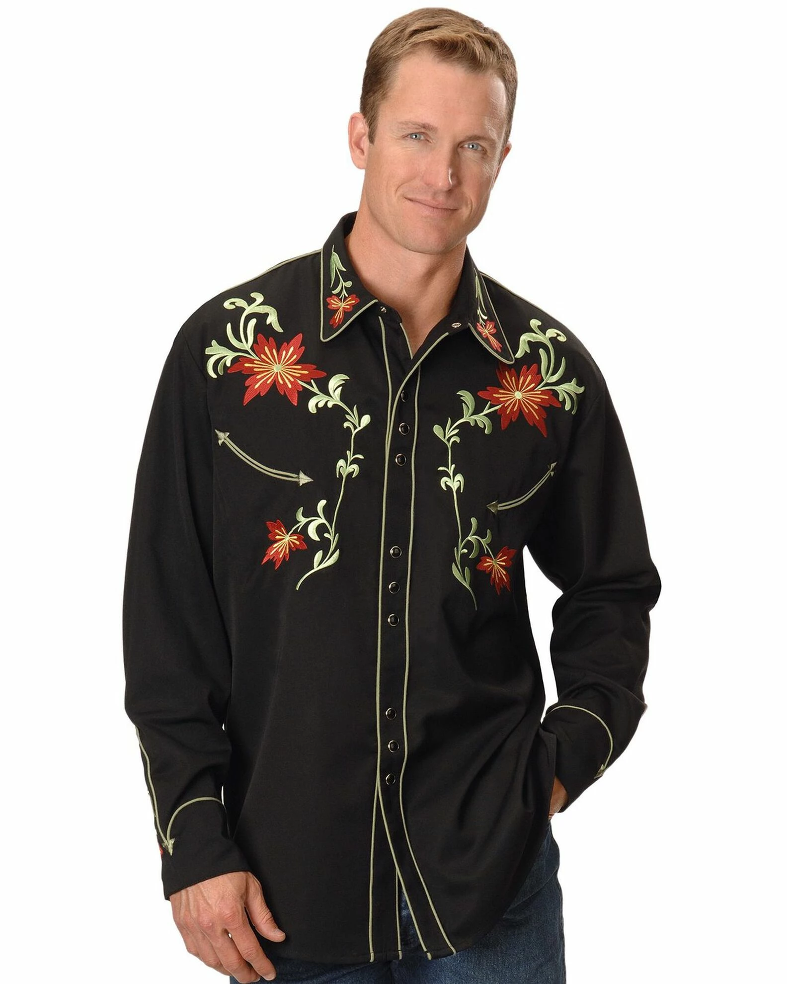 Scully Men’s Floral Embroidered Vintage Long Sleeve Western Shirt Black