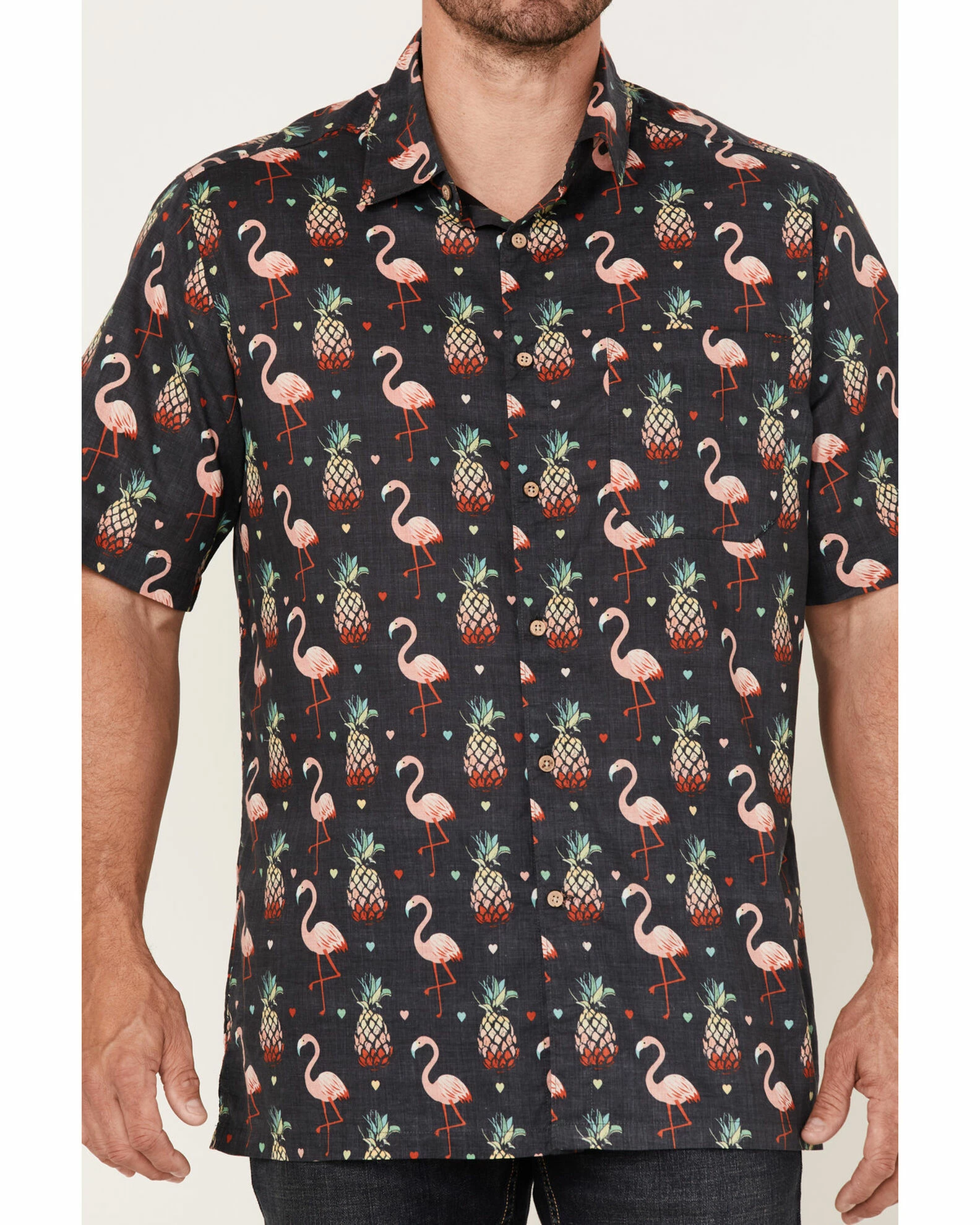 Scully Men’s Pineapples & Flamingos All-Over Print Short Sleeve Button-Down Western Shirt Black