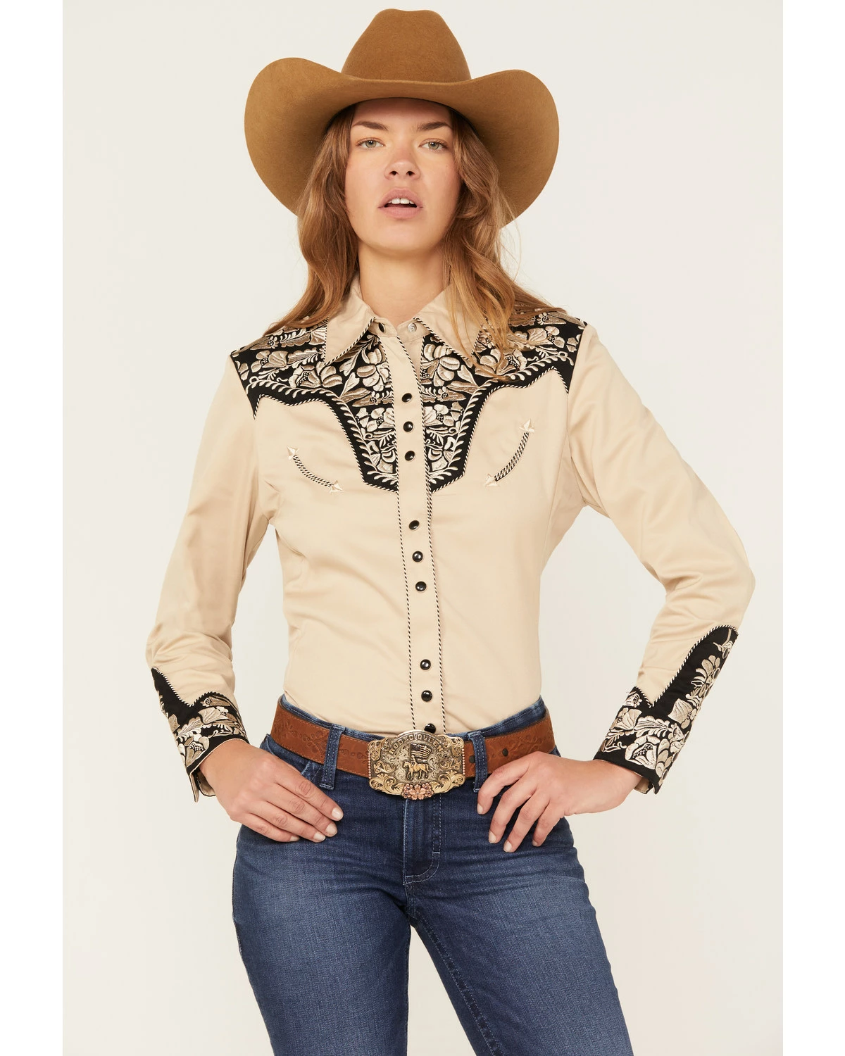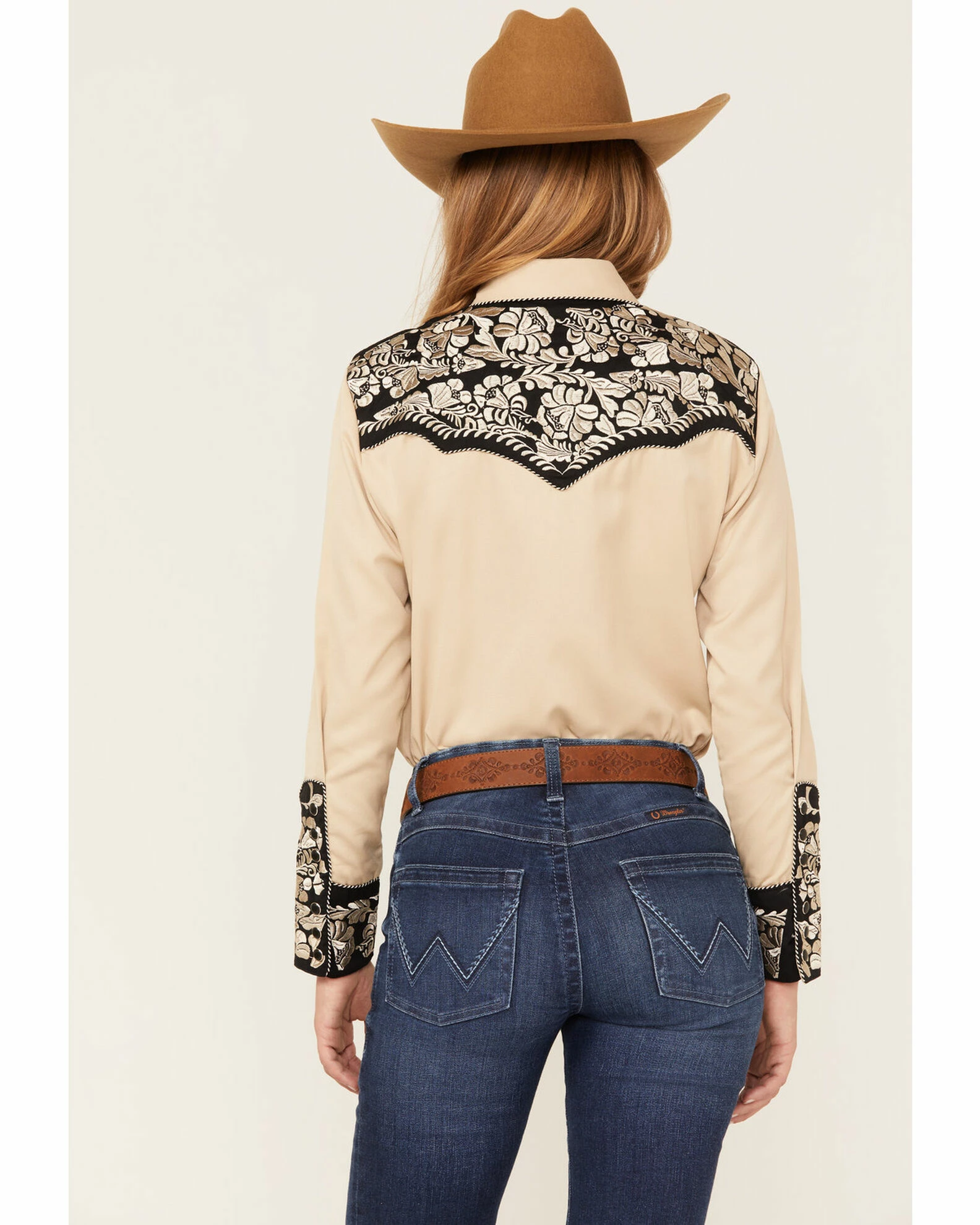 - Floral tooled embroidery on yokes and cuffs